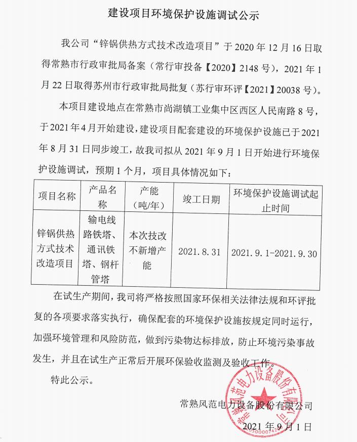 建设项目环境保护设施调试公示(锌锅供热技改)(1)